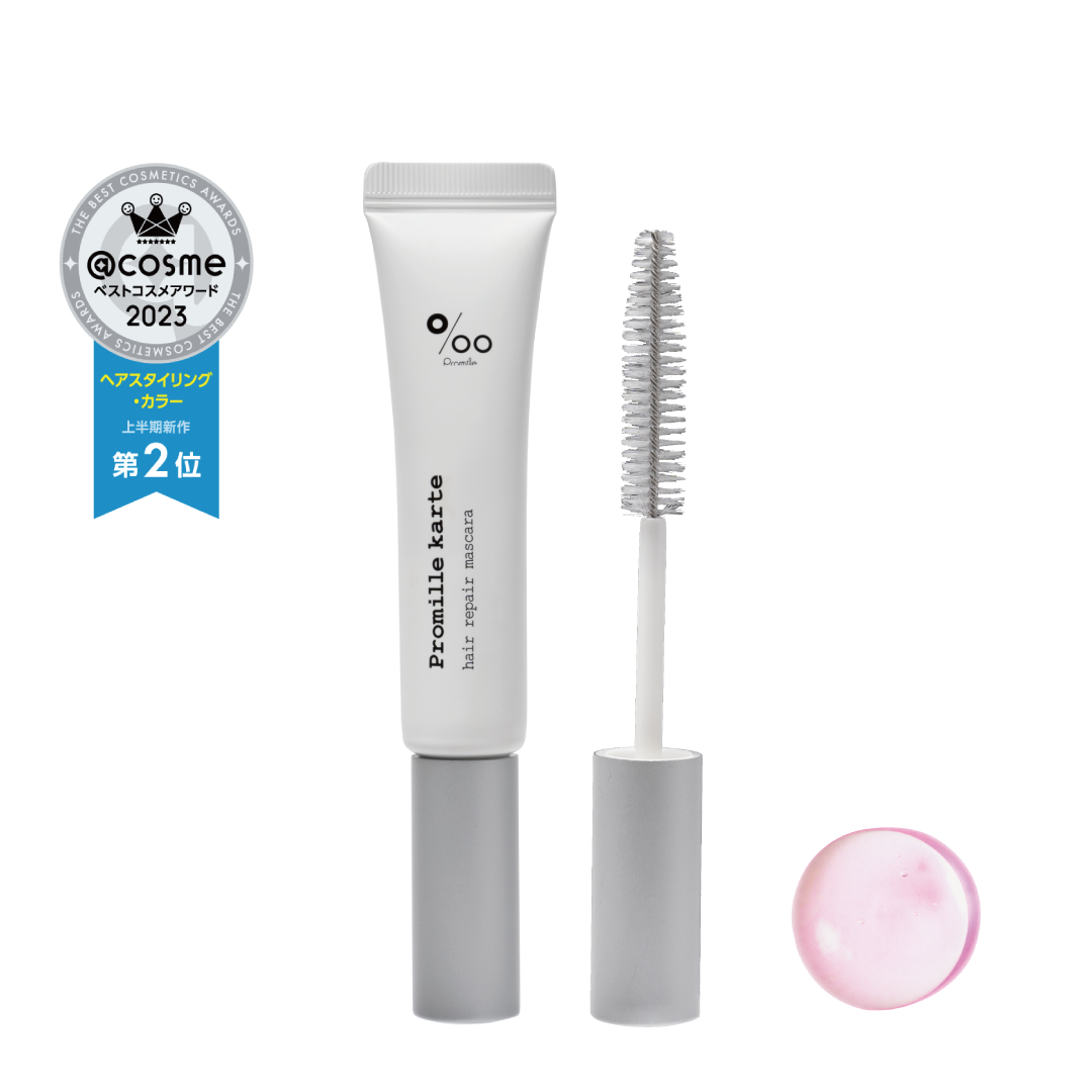 “プロ仕様の”ヘアマスカラ。髪の毛の気になる部分にサッとひと塗りするだけで、前髪の乱れ・アホ毛・おくれ毛などを綺麗に整え、さらに毛髪の保湿&補修までできるポイントヘアメイク商品です。毎日のヘアスタイリングをまるでプロにセットしてもらった時のようにバージョンアップさせることが可能です。乾燥や静電気を抑えるハチミツ*¹と、従来のプロミルシリーズ同様の天然植物オイル*² を配合し、さらに毛髪保護・補修効果のあるフェザーケ ラチン*³を加えました。髪を整えるだけでなく、ダメージを補修しながらツヤ感もプラスするモイストリペアジェル処方により、手軽にケアしながらヘアスタイルを整えることができます。