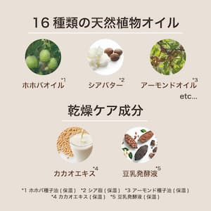 *⁴ゴマ油、ハイブリッドサフラワー油、ホホバ種子油、ヒマワリ種子油、シア脂油、マカデミア種子油、メドウフォ ーム油、コメ胚芽油、ヘーゼルナッツ油、アボカド油、アーモンド油、ツバキ種子油、ブドウ種子油、カニナバラ果実油、月見草油、テオブ ロマグランジフロルム種子油(全て保湿)