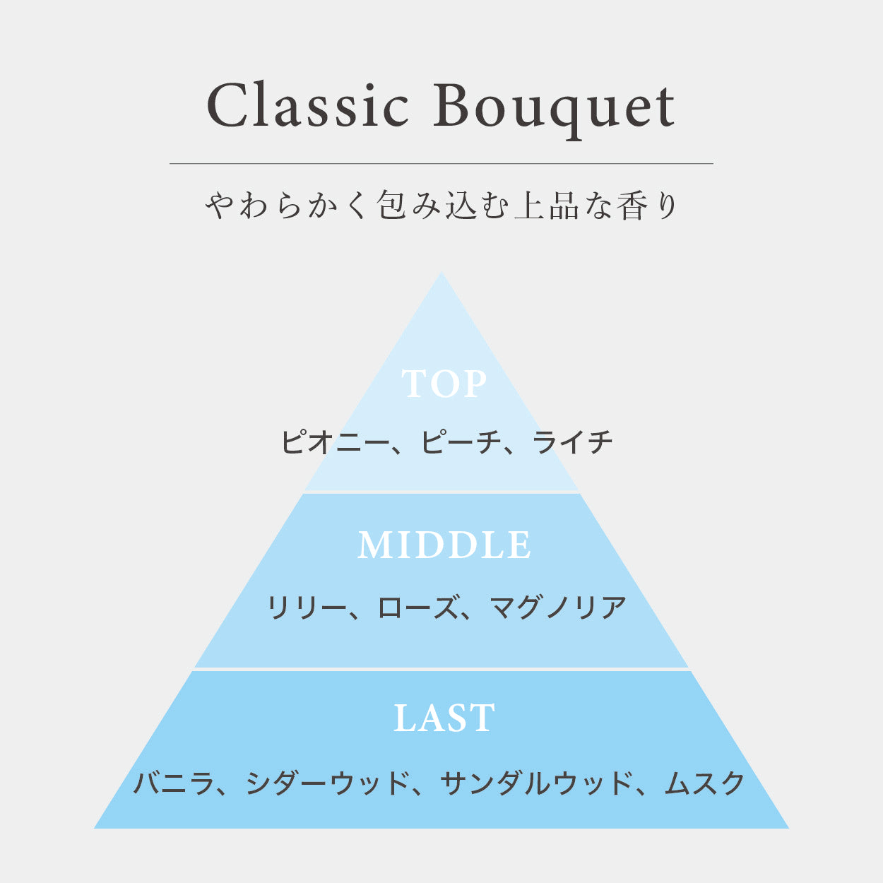 クラシックブーケが華やかに香り、使いやすいさらっとした質感。